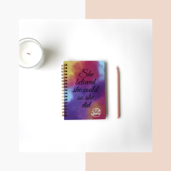 Our A5 soft cover Notebook is made with our artwork print illustrated by Rhea Shah as the cover, with a velvet lamination. The book contains 100 gsm thick paper consisting of 80 ruled pages. Believe A5 Soft cover Notebook