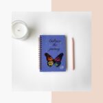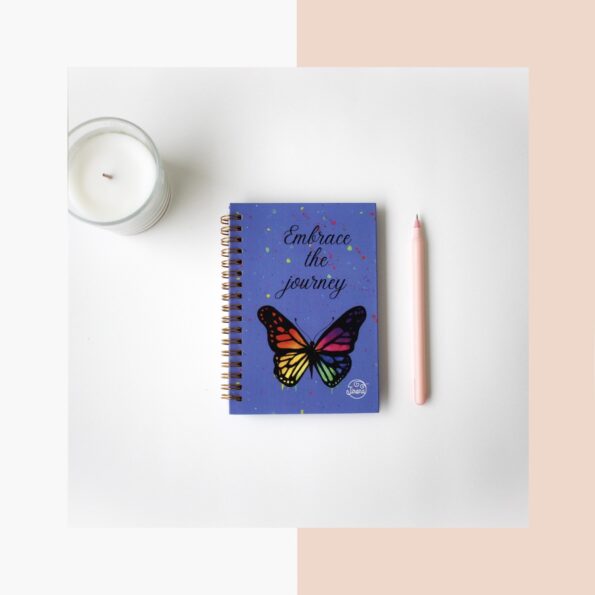 Our pocket A7 spiral Notebook is made with our artwork print illustrated by Rhea Shah as the cover, with a velvet lamination. The book contains 100 gsm thick paper consisting of 50 ruled pages. Pink Butterfly Pocket A7 Spiral Notebook