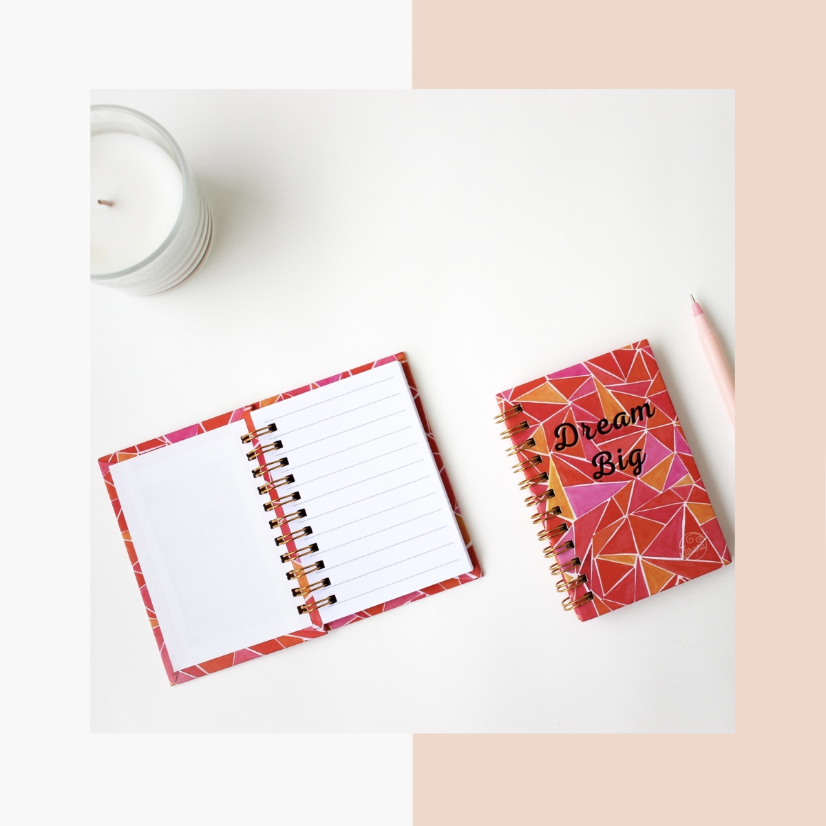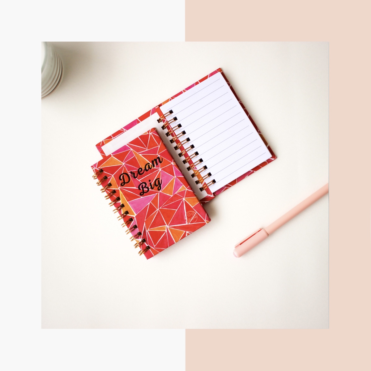 Our A7 pocket spiral Notebook is made with our artwork print illustrated by Rhea Shah as the cover, with a velvet lamination. The book contains 100 gsm thick paper consisting of 50 ruled pages. Dream Big Pocket Notebook