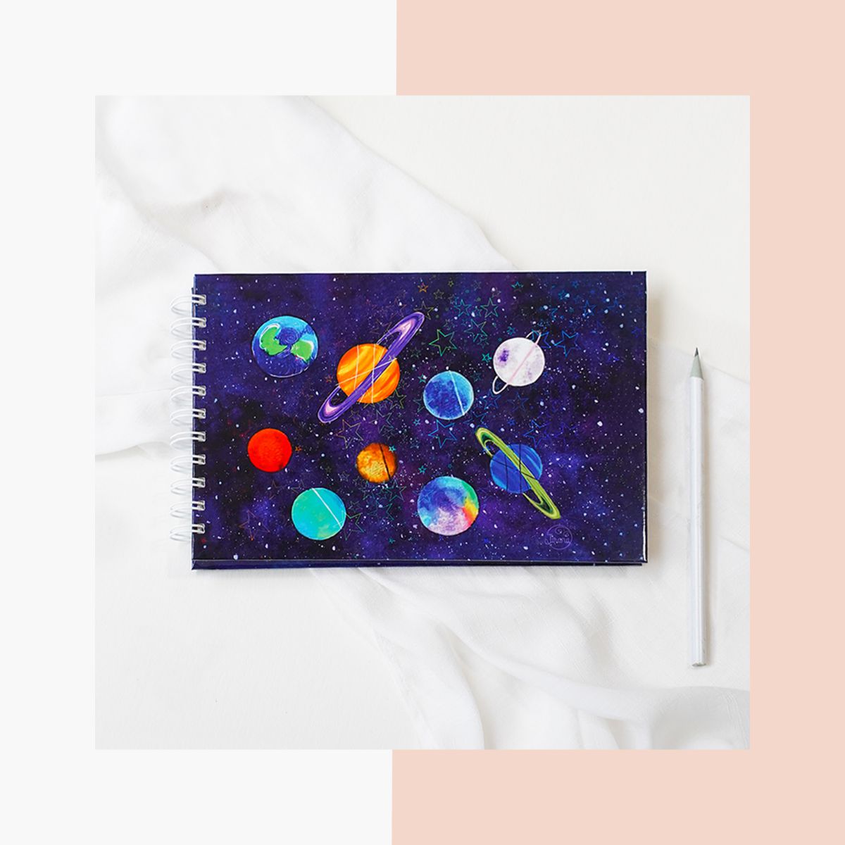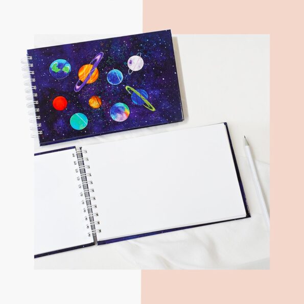 Our A5 Wiro Art Journal, a canvas for your creativity, adorned with Rhea Shah’s enchanting ‘DREAM’ artwork and a shimmering star sparkle lamination on the cover.
