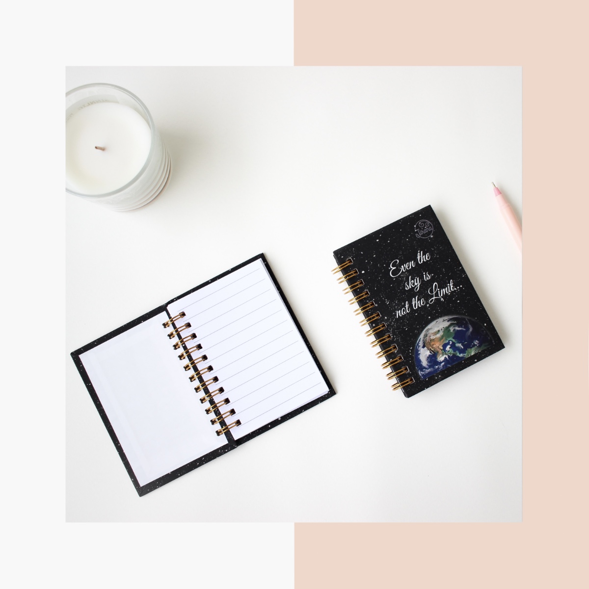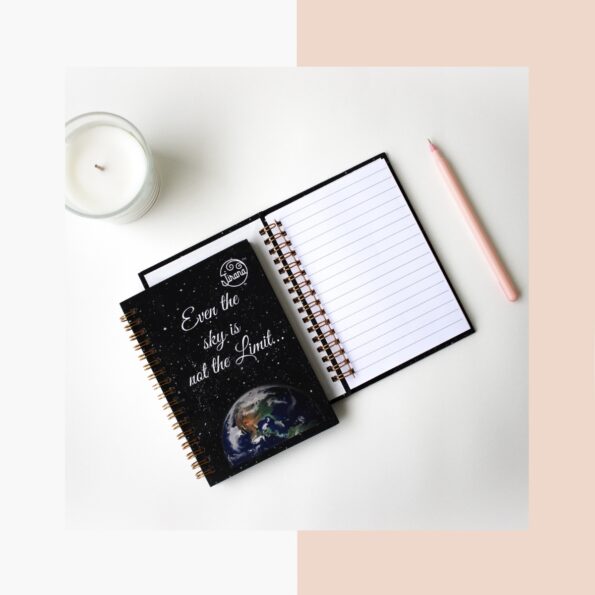 Our A7 pocket spiral Notebook is made with our artwork print illustrated by Rhea Shah as the cover, with a velvet lamination. The book contains 100 gsm thick paper consisting of 50 ruled pages.